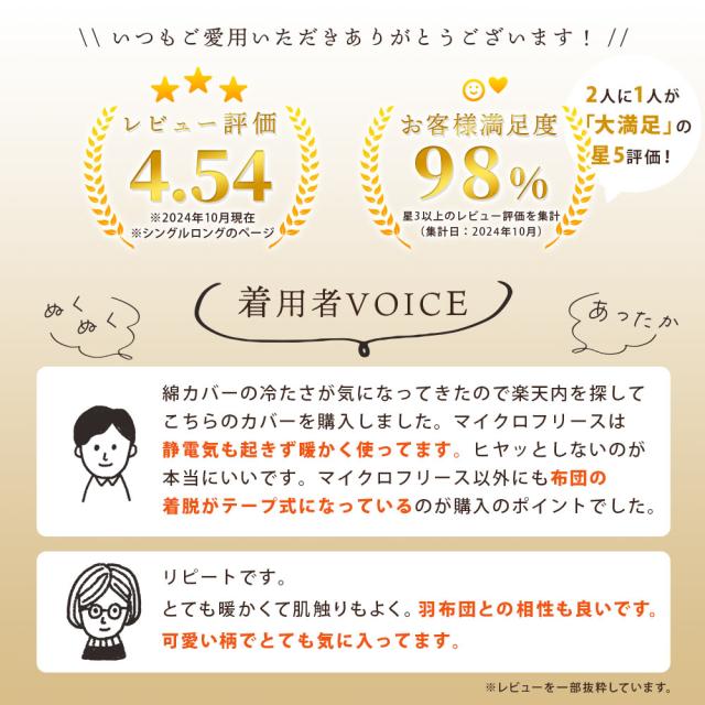 ・マイクロだから実現した手触り がさがさキシキシした今までのフリースとは一味違う、これは「マイクロフリース」素材。しなやかで柔らかな触れ心地を実現しました。冬の寒さをほっこりと包んでくれる、幸せ心地のフリースです。 ・可愛い!両面同柄プリントめくれても、折り返しても、どこから見ても可愛い。 両面同柄プリントだから、寝返りやベッドメイクでも統一感はそのまま。 お部屋のコーディネートが、いつもきれいに決まります。 ・着脱カンタン!ボタン付きテープ中の布団がズレ防止に付いているヒモが、ボタン付きテープ(=ホックテープ)にグレードアップ!洗濯のたびにヒモを結ぶ手間が省けてカバーの付け外しが格段に楽になりました。 |