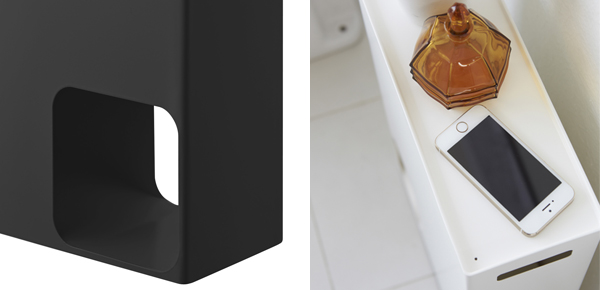 | 両側から取り出せる 両側にロールを取り出す穴があるので、向きを気にせずに設置できます。 | 一時置き場になる ふたはトレーとして、スマートフォンや芳香剤などを置くことができます。 |