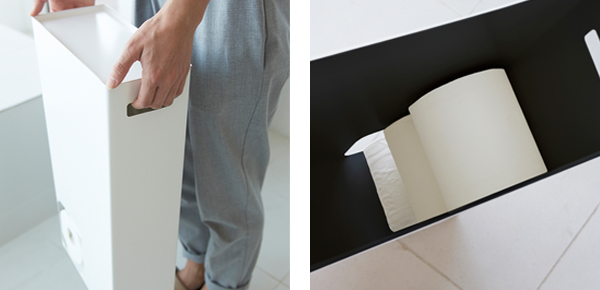 | 取っ手付きで持ち運び楽々 両サイドに取っ手があるので、持ち運びやすく掃除の際も楽に移動できます。 | 無駄なくきっちり収まる トイレットペーパーロールを最大8ロール、無駄なスペースなくきっちり収納でき、スリムで場所を取りません。 |