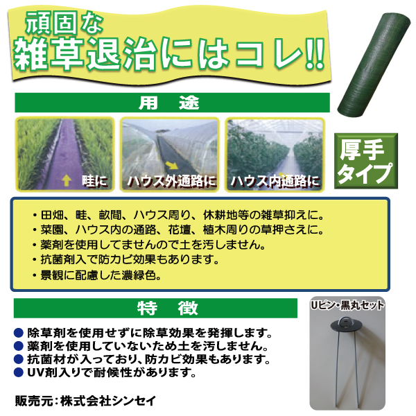 シンセイ 厚手草よけシート(モスグリーン) Uピン・黒丸セット 1.5m×50m
