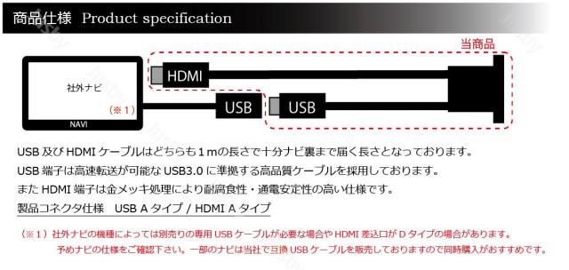 ※ナビによって別途USB接続ケーブルやHDMI変換ケーブルが別途必要な場合がありますのでご注意下さい。