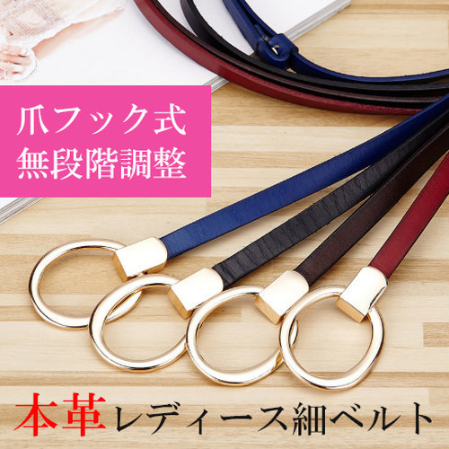 細いベルトですっきりとエレガントな印象を与え、女性らしさを際立たせます。