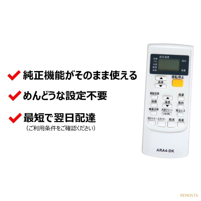 - エアコンのリモコンが壊れて、この時期に焦りましたが、注文して即日で届きました?商品も新品で、注意書きも同封してあり、安心しました。早速使用し、快適に過ごせています。ありがとうございました。
