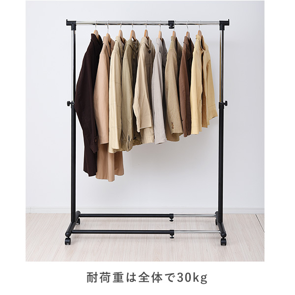 | 商品説明 | ●タテとヨコに伸縮できるハンガーラック ●掛けたいものや、お部屋のスペースに合わせて変形可能 ●最大内寸高さ169cmで、長尺物のワンピースやコートも収納可能 ●シャツ収納目安:20-30着 ●全体耐荷重:30kg ●お部屋に合わせやすい、アイボリー&ブラックの2色展開 ●キャスター付で移動やお掃除の際に便利 ●サイズ調整はノブ式の簡単仕様 ●ハンガーバー内寸:幅63-108 高さ97-169cm |