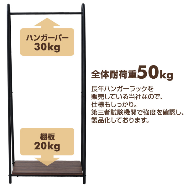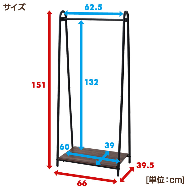 | 商品説明 | ●お気に入りの服を眺めて収納できるハンガーラック ●下のスペースを活用できる棚付き ●奥行き40cm弱のスリムなA型タイプ ●ワンピースやコートをしまえる長尺スペース ●収納目安:20着 ●ハンガー内寸:幅62.5 高さ132cm ●棚板サイズ:幅60 奥行き39cm ●底板下すき間:6cm ●耐荷重:全体50kg、ハンガーバー30kg、棚板20kg |