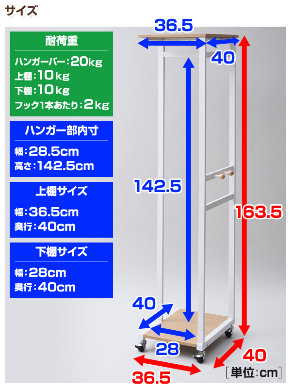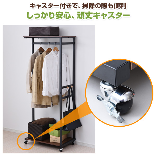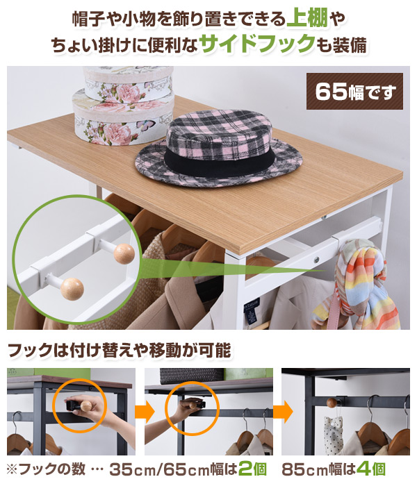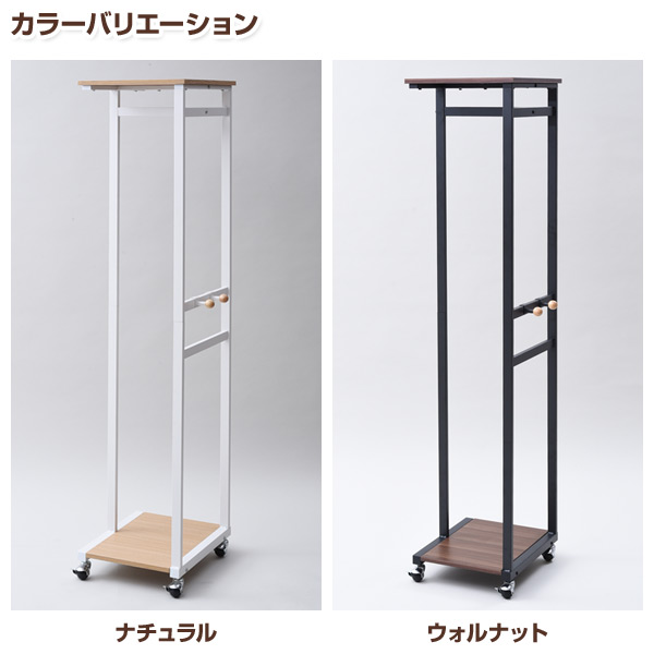 | 商品説明 | ●掛ける、置く、飾る、スペースを有効活用するハンガーラック ●コートやワンピースなど、季節ごとに活躍する長尺衣類の定位置として活躍 ●下の棚には収納ボックスもぴったり、さらに収納効率アップ ●キャスター付きで、掃除の際も便利 ●帽子や小物を飾り置きできる上棚や、ちょい掛けに便利なサイドフックも装備 ●ハンガー部内寸:幅28.5 高さ142.5cm ●上棚サイズ:幅36.5 奥行40cm ●下棚サイズ:幅28 奥行40cm ●耐荷重:全体44kg、ハンガーバー20kg、天板・下棚10kg、フック2kg |