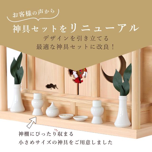 国産・瀬戸焼の神具陶器がセットになった、神棚一式セット。シンプルで洗練された、必要十分な神具が付属します。モダンと「いにしえ」が融合する、神棚セット。