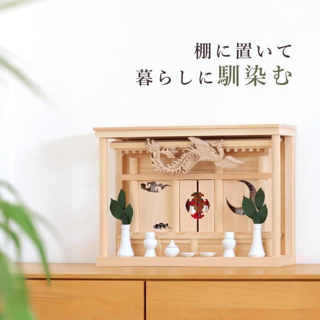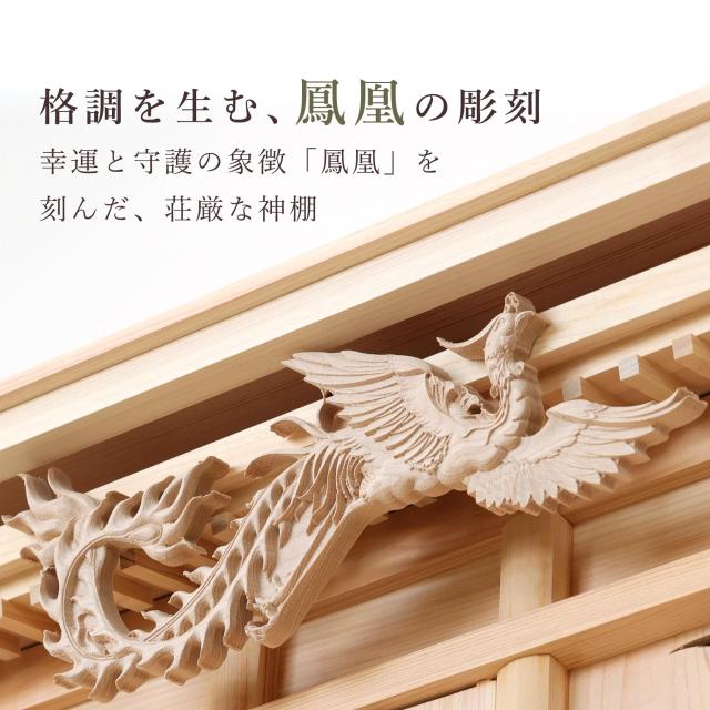 お社には、力強く優しく見守りくださる「鳳凰」が宿っています。天空を舞う不死鳥、永遠を表す象徴を細微な彫刻で表した、美しい神棚。奥行きを抑え、壁に掛けられるモダンなシルエットは、お神札を丁寧にお祀りする「箱宮」の新しいカタチ。