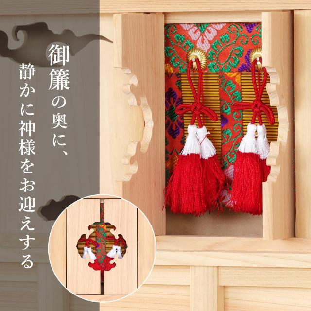 3枚までのお神札が収めやすい、三社宮の形構造となっています。一般のご家庭から店舗、事務所、会社などに適した、存在感のあるサイズ。壁掛け用フックが背面上部に付属しています。皆様の門出に合わせて華やかで豪華な祭壇を。