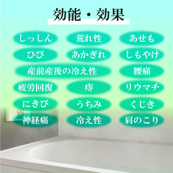 | □効能・効果 しっしん、荒れ性、あせも、ひび、あかぎれ、しもやけ、産前産後の冷え性、腰痛、肩のこり、疲労回復、痔、リウマチ、にきび、うちみ、くじき、神経痛、冷え性 |
