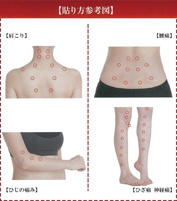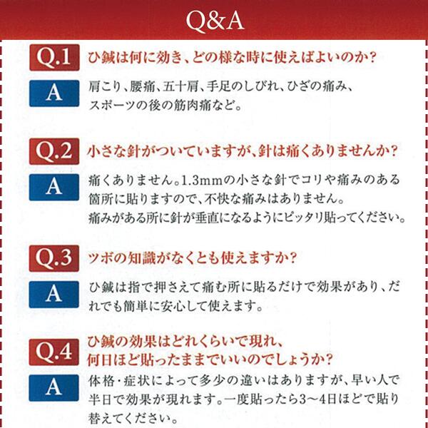| □使用方法 首、肩、腰等こりのある所、痛い所に貼って下さい。皮膚に直角に正しく貼ってください。針が斜めになったり浮いていますと、痛みを感じることがあります。 |