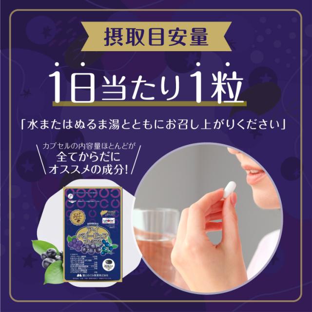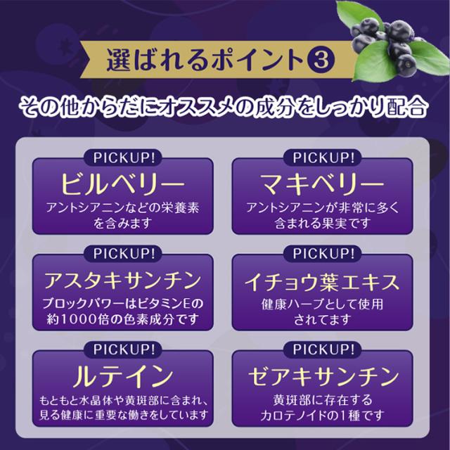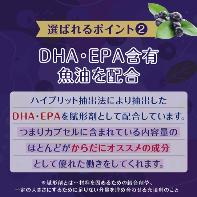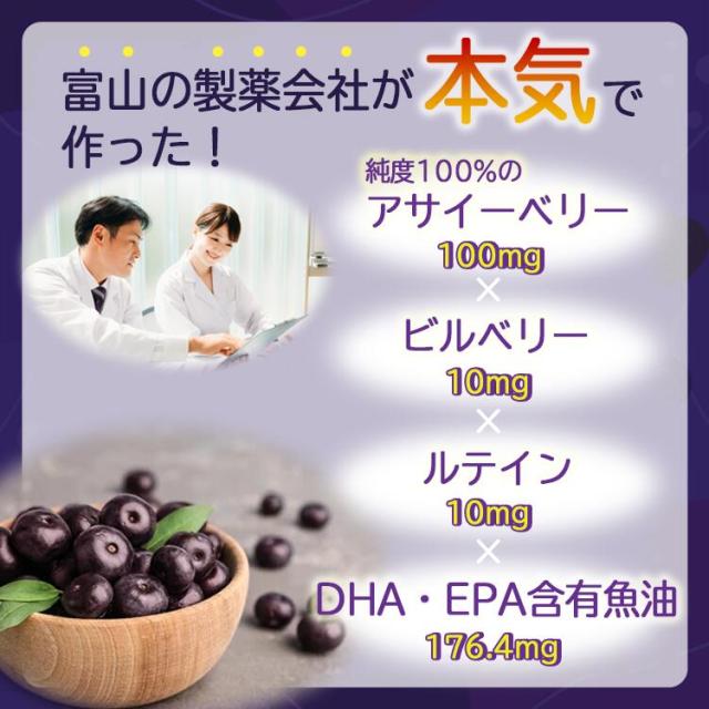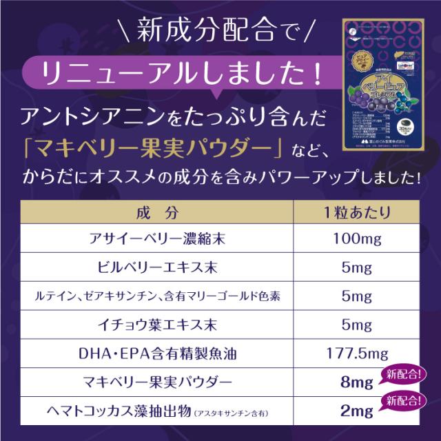 | □原材料名 DHA・EPA含有精製魚油(国内製造)、アサイーベリー濃縮末、ビルベリー果汁パウダー、ビルベリー抽出物、イチョウ葉エキス末、ヘマトコッカス藻抽出物 / ゼラチン、グリセリン、グリセリン脂肪酸エステル、ミツロウ、カラメル色素、マリーゴールド色素、ビタミンA |