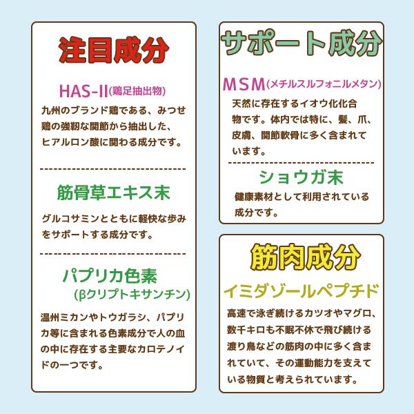 | □原材料名 還元パラチノース(国内製造)、鶏足抽出物、さけ軟骨抽出物、MSM、筋骨草エキス末、チキンエキス末、さけ鼻軟骨抽出物、赤ショウガエキス末 / グルコサミン、HPC、セルロース、ステアリン酸カルシウム、微粒酸化ケイ素、セラック、パプリカ色素、(一部にさけ・鶏肉・ゼラチンを含む) |