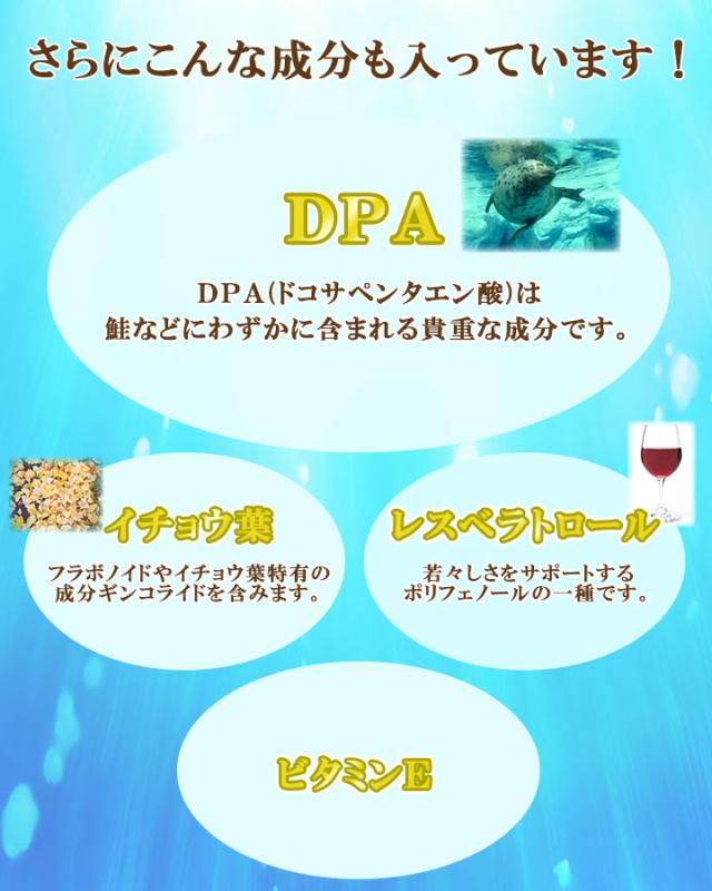 | □原材料名 DHA・EPA含有精製魚油(国内製造)、アマニ油、エゴマ油、イチョウ葉エキス末、サーモンオイル、赤ワインエキス末、ヘマトコッカス藻抽出物 / ゼラチン、グリセリン、グリセリン脂肪酸エステル、ミツロウ、カラメル色素、ビタミンE |