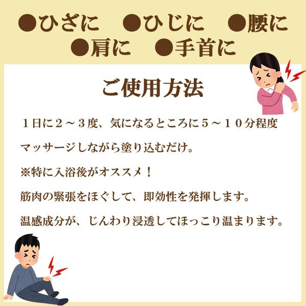 | □使用方法 適量を必要部位に塗布し、マッサージしながら良くなじませてください。使用者の肌質により白残りすることがありますが、マッサージを続けることにより消失します。塗布にかける時間の目安にしてご使用ください。 |