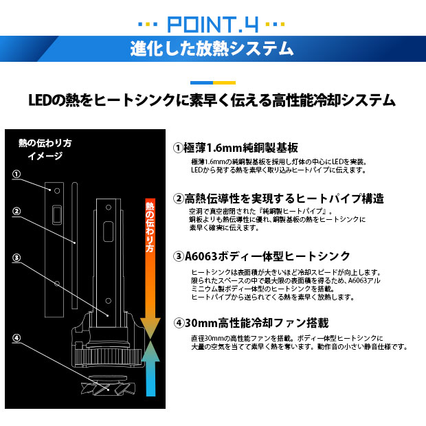 バルブに搭載したファンが故障しバルブの冷却ができなくなった場合や、動作周囲温度が設定値を超えた場合等の非常事態には出力を下げてLEDバルブや車両の破損を防ぎます。