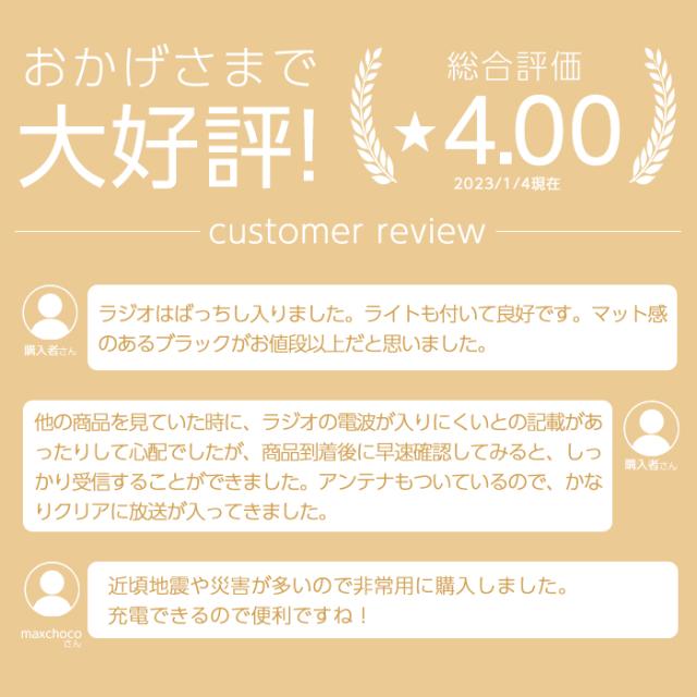 - スムーズな発送等ありがとうございました。もしもの備えに防災ラジオを購入しました。ケーブルが私のスマホには合わなかったのが、少し残念でした。それ以外は満足でした。