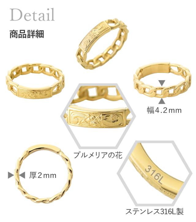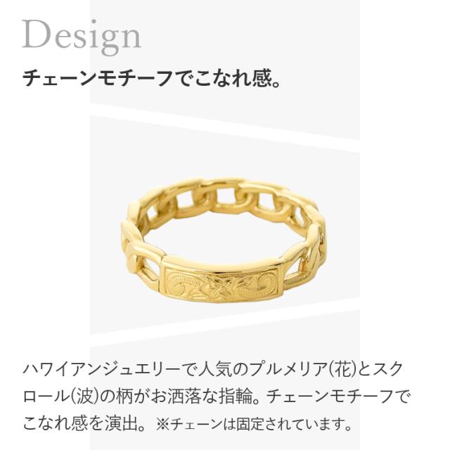 ハワイアンジュエリー リング レディース ステンレス つけっぱなし プルメリア スクロール チェーンリング イエローゴールドカラー おしゃれ ハワイアン 指輪 サージカルステンレス 316L ノンアレルギー 金属アレルギー対応(grss658yg)