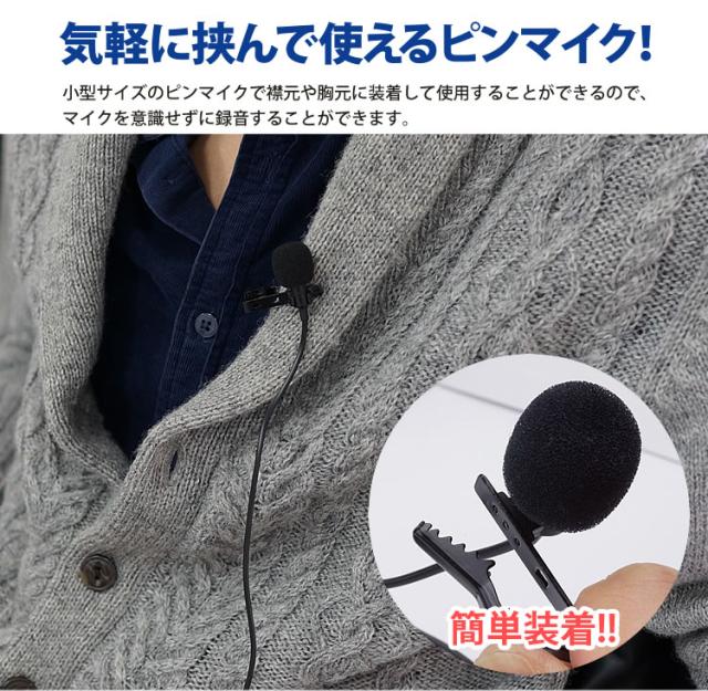 小型サイズのピンマイクで襟元や胸元に装着して使用することができるので、マイクを意識せずに録音することができます。