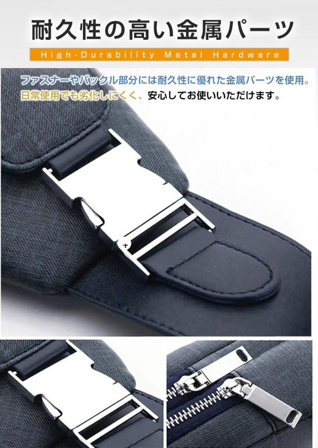 | 【耐久性の高い金属パーツ】 | ファスナーやバックル部分には耐久性に優れた金属パーツを使用。 日常使用でも劣化しにくく、安心してお使いいただけます。 |