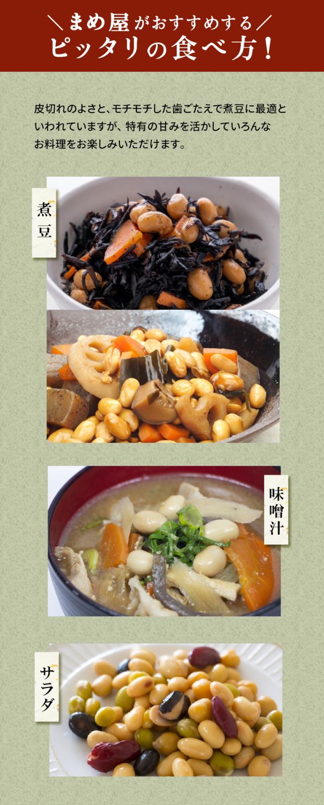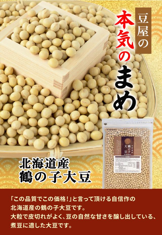北海道で栽培された大豆です。「畑の肉」といわれとても親しまれている豆です。いろいろなお料理に幅広くご使用いただけます。「鶴の子」は北海道南部で生産されている品種銘柄で、高級大豆の代名詞的存在です。煮豆に適した最高級品種「鶴の子大豆」。大粒で皮切れが良く、ショ糖の割合が非常に高く豆の自然な甘さをかもし出している、煮豆に最も適した大豆と言われています。普通の大豆として栽培量の多い「フクユタカ」と比べ、「鶴の子大豆」は大粒で艶と光沢があります。 しかも食べた時の皮の切れやすさやモチモチとした食感など「煮豆」に必要な条件が全て揃っています。