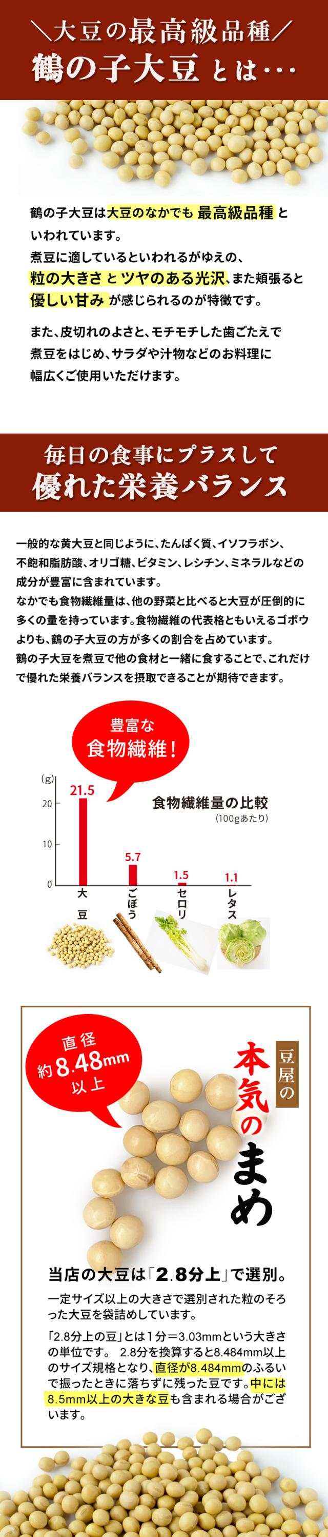 「鶴の子」は北海道南部で生産されている品種銘柄で、高級大豆の代名詞的存在です。煮豆に適した最高級品種「鶴の子大豆」。大粒で皮切れが良く、ショ糖の割合が非常に高く豆の自然な甘さをかもし出している、煮豆に最も適した大豆と言われています。
