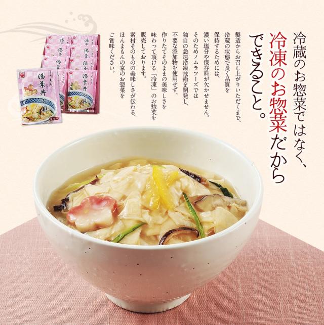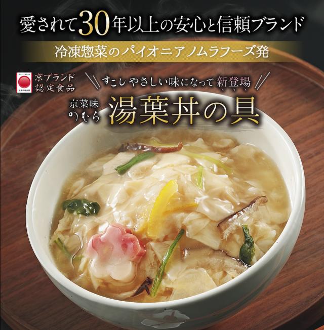 比叡山延暦寺御用達の「ゆば八」から仕入れた生湯葉を使った、とろーりあんかけの湯葉丼の具です。柚子香を効かせ利尻昆布だしを中心に、かつおだしを合わせて深みを出したあんを絡め、「壬生菜」や国産椎茸、そして梅麩をあしらいました。ご飯だけでなく、麺などにかけても美味しくお召し上がりいただけます。