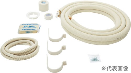 ・エアコン据付工事で使用する配管と部材のセットです。・配管はフレア加工及びフレアナット挿入済みです。・フレア部分の保護と配管内への埃や塵の侵入防止の為に、樹脂製ナットでキャップをしてあります。・樹脂製ナットを外せば、そのままエアコンに取付できます。・配管の長さに合わせてセレクトできるように様々な長さの製品を用意しています。・銅管は JIS H 3300 C1220T 規格品を使用し、高圧ガス保安法 冷凍保安規則関係例示基準に適合しています。・保温材は JIS A 9511 A-PE-C-2 に準じた化学架橋30倍発泡ポリエチレンを使用しています。・廉価な製品とは異なり、保温材部分は耐熱120℃の高品質保温材を100%使用しています。・保温材の表面には、取り回し時に傷が付きにくくテープ巻が行いやすい、エンボス加工処理を施したフィルムを付けています。