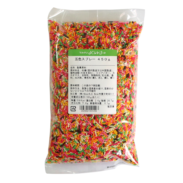 白、黒の他、赤、橙、黄、ピンク、緑のチョコレートが入ったカラフルなスプレーチョコレート。