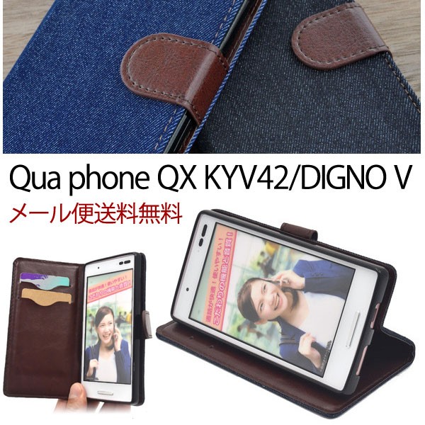 au Qua phone QX KYV42/ UQmobile DIGNO V 兼用 手帳 手帳型 Qua phone キュアフォン QX カバー デニムデザイン
