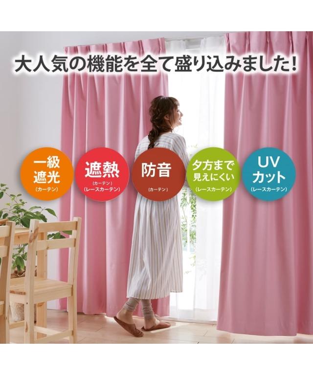 カーテンには遮熱・防音・1級遮光の機能を、レースカーテンには遮熱・UVカット・見えにくい機能を持たせた大人気の多機能カーテン&レースセット。しっかり日差しを遮ってくれる1級遮光と、エコな遮熱機能で外気の熱を窓辺でブロックして、室内の冷暖房効率を高め1年中快適な環境へサポートします。セットで使うことでさらに効果もアップ!美しい立体感とハリが魅力のブッチャー織で10色をご用意、どんなお部屋もぴったりマッチします。