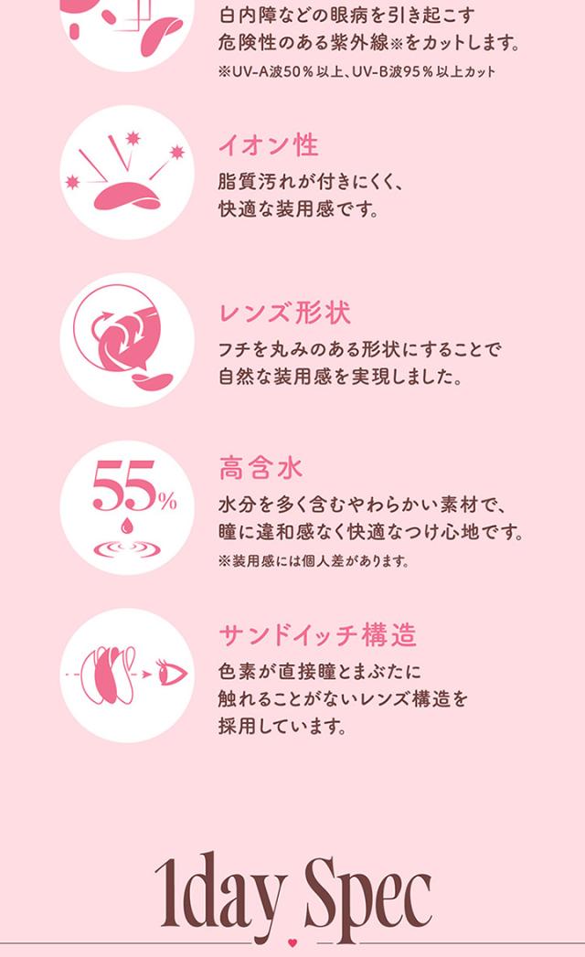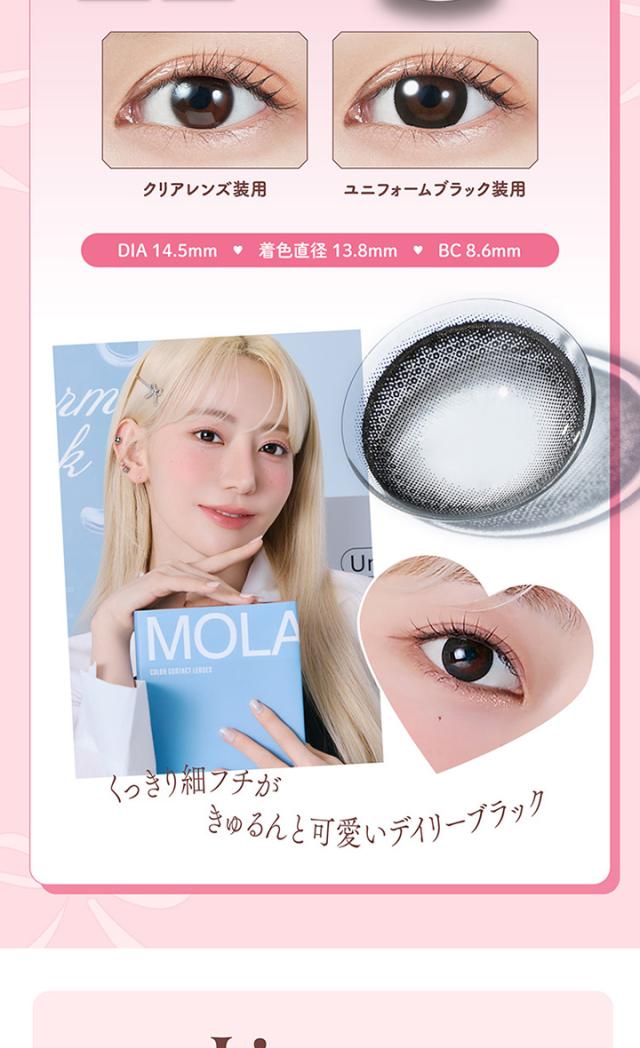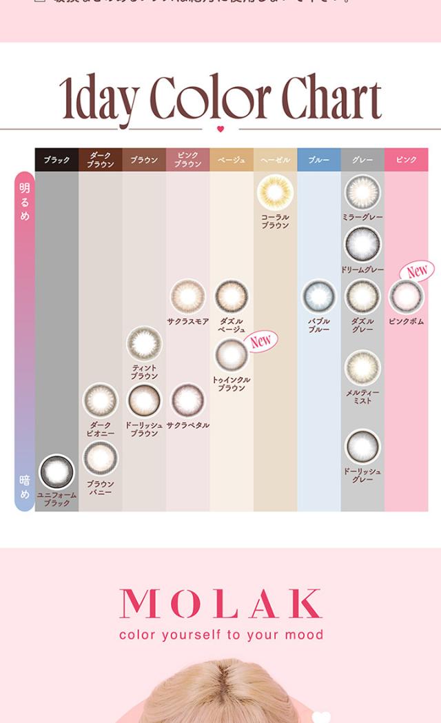 ■商品名: molak 1day■枚 数: 1箱10枚入×3箱セット■使用期限: 1日使い捨て■度数(POWER): 度なし(±0.00) -0.50〜-6.00(-0.25ステップ) -6.50〜-10.00(-0.50ステップ)■直径(DIA): 14.2mm / 14.5mm ■ベースカーブ(BC): 8.6mm■含水率: 55%■種 別: カラコン,カラーコンタクト,カラーコンタクトレンズ コンタクトレンズ,コンタクト■区 分: 高度管理医療機器■医療機器承認番号: 22900BZX00118000■製造販売元: PIA株式会社■販売元: PIA株式会社