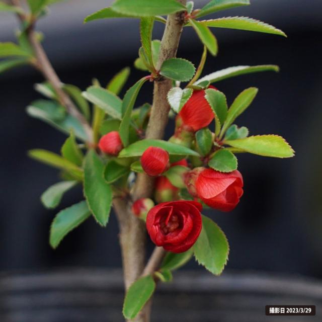 長寿梅は野ボケの一種で枝には鋭いトゲがあります。木瓜(ボケ)に比べ太りは遅いですが、芽吹きがよく、剪定を繰り返すとふわっと柔らかい株立ちに仕立てられます。生長が遅いのと、名前の縁起の良さから敬老の日のギフトに人気があります。