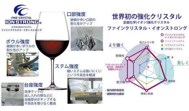 世界水準の輝きと光沢・透明感をもつ「ファインクリスタル」に独自の化学(イオン)強化加工技術「イオンストロング」を施すことにより、さらに強度がおよそ1.5倍(メーカー比較試験より)向上し、優れた耐久性を実現しました。グラス全体に強化加工をすることで、細脚・口肉薄のステムウエアも安心してお使いいただけます。