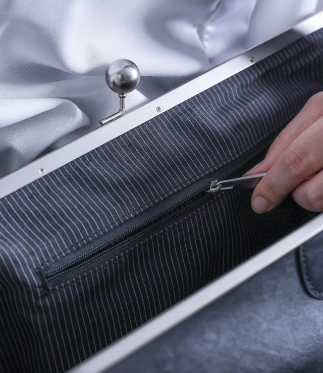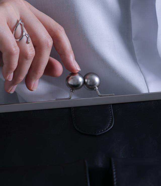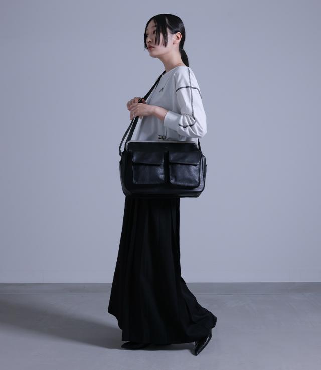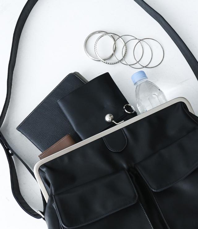 ■デザイン 立体的なフォルムのがま口デザインが、モードな印象に導くショルダーバッグ。A4サイズ対応で必要なものを持ち運べる収納力と、複数あるポケットで機能面も充実しています。大きく開閉できるがま口で取り出しやすさも◎男女問わず使用できるユニセックスデザインです。 ■素材 くたっとした質感と、こなれたシワ感のあるPUレザーを使用。内側はさらっとしたストライプ柄の生地を使用し、異なる質感の組み合わせで高級感を演出します。 ■ディティール ・マチのついた正面ポケット ・内側オープンポケット ・荷物が沈みにくい、広めのマチ ■コーディネート シンプルなスタイルに合わせるだけで個性的な印象に。モードなスタイルはもちろん、カットソーやデニムにも馴染んでお洒落に見せるバッグです。 |