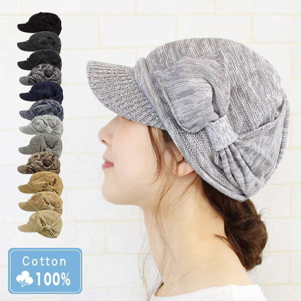 キャスケット レディース リボン 春夏 メール便送料無料 医療用帽子 おしゃれ 綿100% ニット帽 つば付き 抗がん剤 帽子 ケア帽子 可愛い キャップ かわいい 治療 外出用 白髪隠し 薄毛 通院 脱毛 上品 ミセス 秋冬【ナチュラルコットン100%つば付きリボンニット帽】