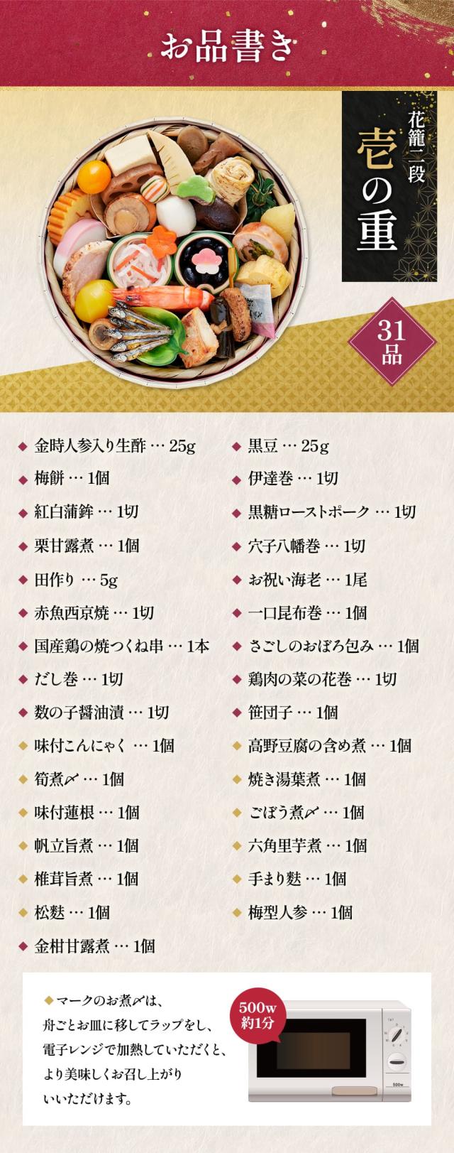 花を生ける様に彩り鮮やな料理31品目を竹籠に詰合せました。色々な味を少しずつ楽しめる、バラエティー豊かなオードブルおせちです。お二人で1セットずつはもちろん、来客用や贈り物にも最適な一品です。