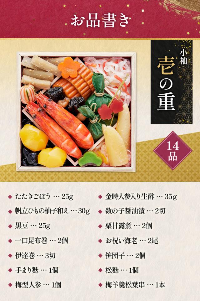 おせちの定番食材である「お祝い海老」「黒豆」「数の子」を中心に少しずつ色々なものを楽しんで頂きたいという思いを盛り合わせました。少人数のご家族に喜んで頂けるミニおせちです。