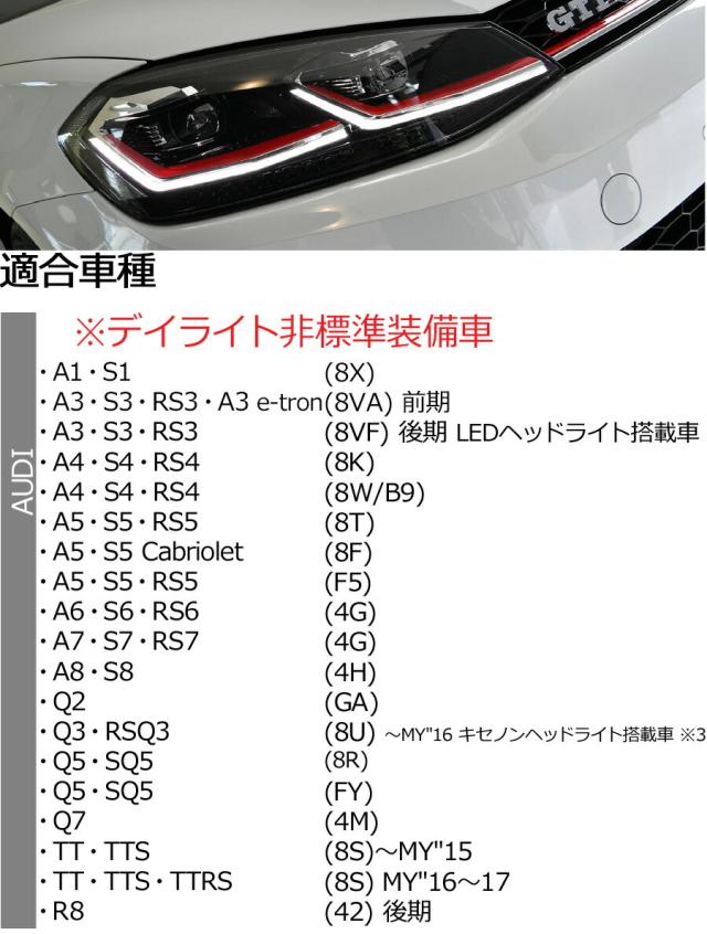 ![]() ![]() ![]() ![]() デイライト機能を有効にし、車両設定メニューにデイライトの ON・OFF 項目(一部の車両除く)が追加されます。 DRL は基本的にヘッドライト点灯時に減光し、スモールランプやウィンカー点灯時にも減光・消灯します。※ 技術的な作業は一切必要無く、車両の OBD2 ポートに差し込むだけ。ランプがグリーン点滅からイエロー点灯になったら完了です。元に戻したい場合は再度 挿入するだけ。今度はグリーン点滅からブルー点灯になったら完了です。 本製品の内部に DIP スイッチを内蔵し、リカバリーモードを搭載しております。万が一の際に対して本製品を挿す前の車両状態に戻す事が出来る機能です。 ![]() ------------------------------------- <適合> AUDIアウディ ※デイライト非標準装備車 ・A1・S1 (8X) ・A3・S3・RS3・A3 e-tron (8VA) 前期 ・A3・S3・RS3 (8VF) 後期 LEDヘッドライト搭載車 ・A4・S4・RS4 (8K) ・A4・S4・RS4 (8W/B9) ・A5・S5・RS5 (8T) ・A5・S5 Cabriolet (8F) ・A5・S5・RS5 (F5) ・A6・S6・RS6 (4G) ・A7・S7・RS7 (4G) ・A8・S8 (4H) ・Q2 (GA) ・Q3・RSQ3 (8U) 〜MY"16 キセノンヘッドライト搭載車 ※3 ・Q5・SQ5 (8R) ・Q5・SQ5 (FY) ・Q7 (4M) ・TT・TTS (8S)〜MY"15 ・TT・TTS・TTRS (8S) MY"16〜17 ・R8 (42) 後期 ------------------------------------- ◎本製品は、純正LEDポジションランプ部を欧州仕様のデイライトに変更いたします。 ※上記適合車種て?アッフ?テ?ートによるテ?イライト標準装備車 は、PLUG DRC!か?適合となります。 メニューにON/OFF 項目を追加し任意でのON/OFF が可能となります。 また、テールランプおよびナンバー灯が点灯している車両は消灯となります。 ※ スモールランプやウィンカー点灯時は、車種によって減光・消灯のパターンが異なります。 ※リカバリーモードについて: 本製品をインストールする前の車両状態に戻す事が出来る機能です。 ※1 一部車両では施工できない場合がございます。 ※2 メニューにデイタイムライト項目がない車両は、デイタイムライトON/OFF項目が追加されます。 ※3 MY2015、2016のLEDヘッドライト搭載車両は車両のアップデートによりデイライトができなくなります。 ※5 デイライト標準装備車の場合はデイライトをOFFにすることができるようになります。 車両の仕様のためメニューにON/OFF項目は追加されません。 ●あらたに追加された車種やソフトウェアのアップデート等がありますので、購入される前に販売店へ適合をご確認下さい。 ●本製品は車両の車体番号にて管理しています。別の車両には使用出来ません。 ●一部の車両で適合しない場合がございます。 ●車両の設定画面にデイライトの項目が追加され、初期値ではチェックが付いてないとデイライトが点灯しませんので、確認後チェックをつけてDRLが点灯することを確認してください。 ●車両のコンピュータのアップデートによって対応出来ない場合があります。 ●本製品を購入後1年以内に車両ソフトウェアがバージョンアップした場合、対応出来次第無償にて製品のソフトウエアをアップデートさせていただきます。尚、ソフトウェアのアップデートサービスが終了した製品につきましては購入後1年以内でも保障対象外とさせていただきます。 ※本製品の適合している車両でも、予告なく変更された車両仕様により本製品をインストールができない場合があります。それに伴う発生した工賃・部品などの費用はお客様のご負担となります。 ●本製品はコーディング変更や他社の製品による同等の変更に対して使用すると、正常にインストール出来ない場合がありますので併用しないでください。保証対象外となります。 ●製品はご購入日より1年保証となります。 ![]() ![]() ![]() |