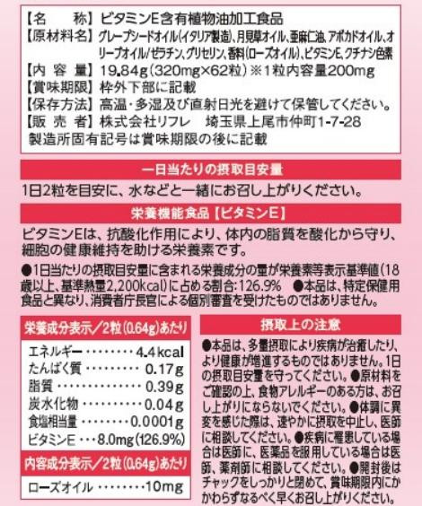 | 2粒に約30本分のバラを凝縮。飲むと胃の中でカプセルが溶け、ほのかにバラの香りが漂います。口臭が気になる方や、人と接する機会が多い方、バラの香りが好きな方にもおすすめのサプリメントです。また、ビタミンEやグレープシードオイルなど、美容や健康に役立つ成分も含まれています。 【お召し上がり方】 1日、目安2粒を水またはぬるま湯でお召し上がり下さい。 【保存方法】 高温多湿、直射日光を避け、チャックをしっかり閉めて保存してください。 【注意】 ※開封後はお早めにお召し上がり下さい。 ※原材料をご参照のうえ、アレルギーのある方もしくは、体調の優れない場合にはご利用をお控ください。 【製造者】 株式会社リフレ 〒362-0035 埼玉県上尾市仲町1-7-28 |