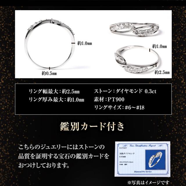 【素材・商品サイズ】ストーン:ダイヤモンド 0.3ct up (10石使用) 鑑別書カード付 リング最大幅:約2.5mm 最小幅:約1.0mm リング最大厚:約1.0mm 最小厚:約0.5mm リングサイズ:6号~18号 金性:プラチナ PT900