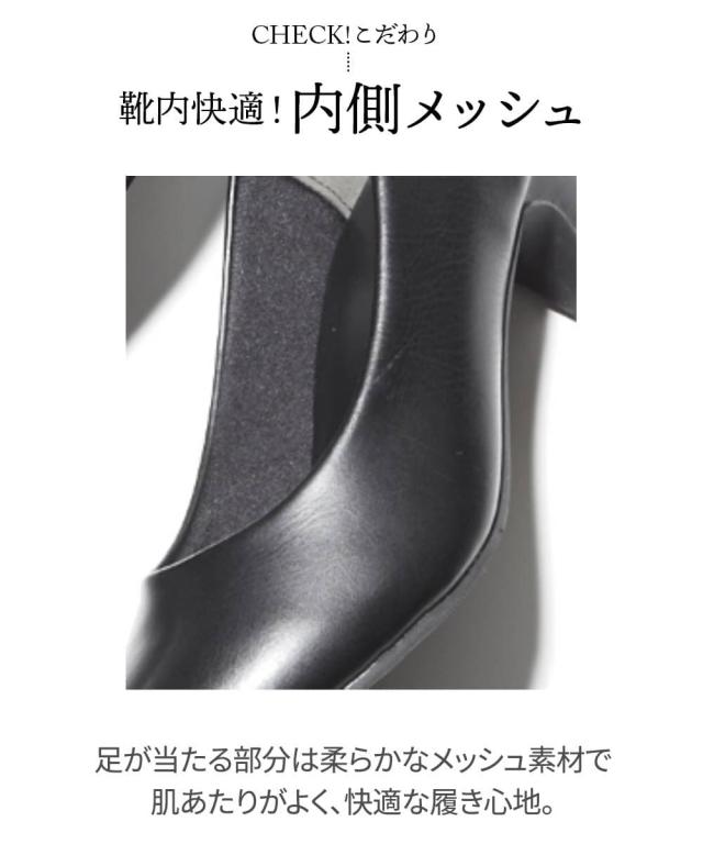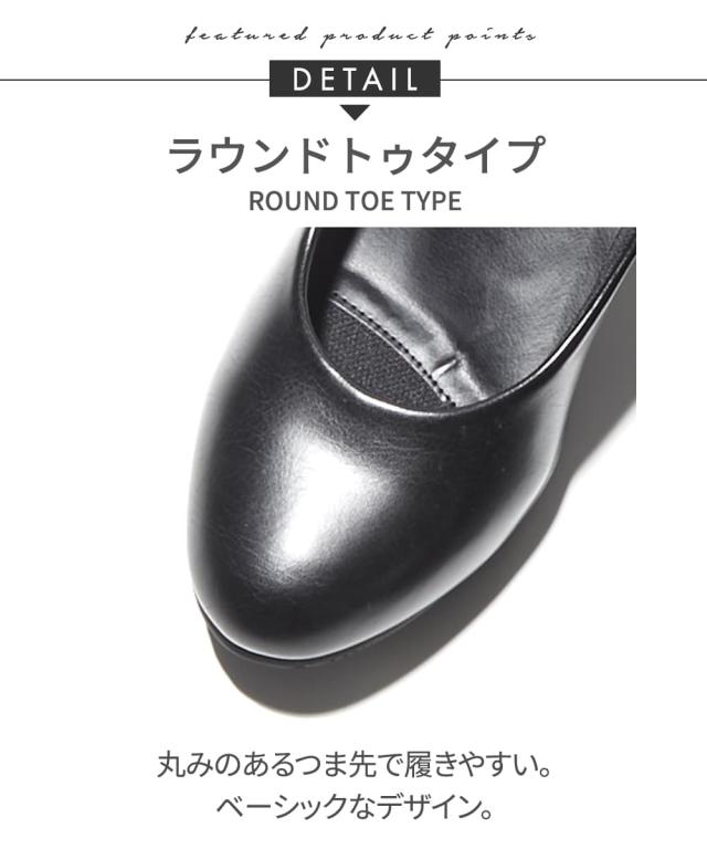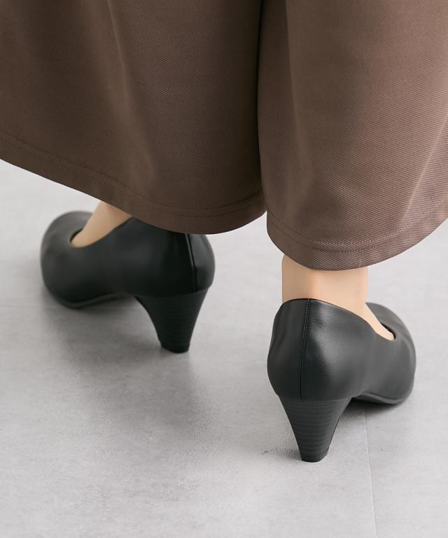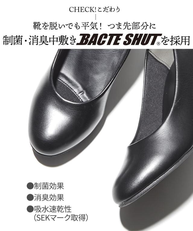窮屈感の少ない丸いつま先で履きやすい、ラウンドトゥパンプス。脚がキレイに見えるミドルヒール。制菌・消臭効果のあるバクテシャット中敷きや内側メッシュ、かかとパッド、立体クッションと、長時間快適に履ける工夫がいっぱいのお仕事パンプスです。