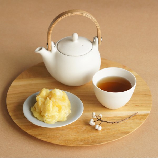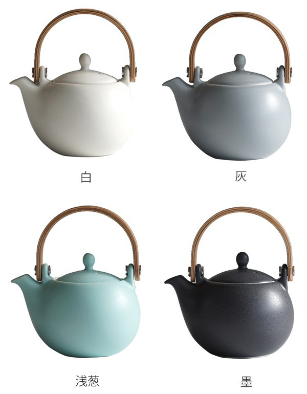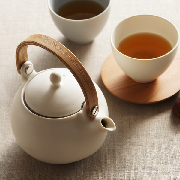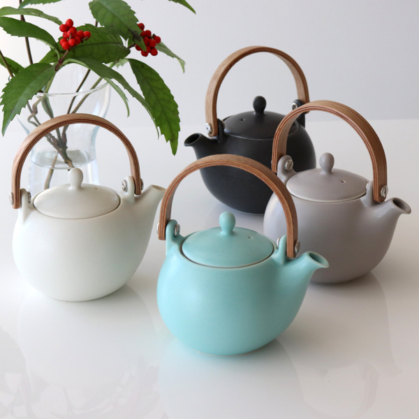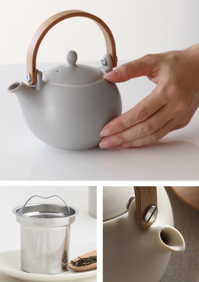 2〜3人分のお茶を淹れるのにちょうど良いサイズの土瓶急須です。マットな質感の釉薬と、曲げ木の持ち手との組み合わせが新鮮です。普段使いしやすく日常にしっくりと馴染むシンプルなデザインです。