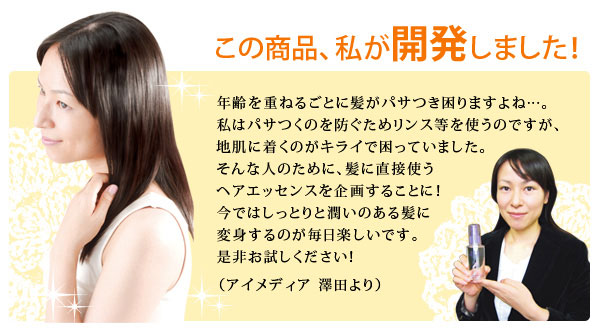 洗い流さない髪の美容液。洗髪後につけドライヤーで乾かすと、しっとりしたツヤある髪に。