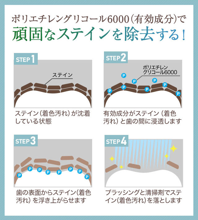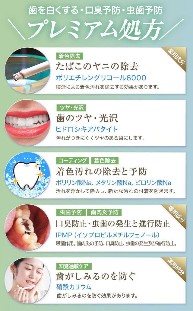 | (基剤)精製水、(有効成分)硝酸カリウム・ポリエチレングリコール6000・イソプロピルメチルフェノール、(増粘剤)カルボキシメチルセルロースナトリウム、(清掃剤)メタリン酸ナトリウム・ポリリン酸ナトリウム・ピロリン酸ナトリウム・ヒドロキシアパタイト、(可溶剤)エタノール・ポリオキシエチレン硬化ヒマシ油、(保存剤)グリセリン脂肪酸エステル・塩化セチルピリジニウム、(清涼剤)I-メントール、(清掃助剤)酸化チタン、(着香剤)香料:アップルミントタイプ、(pH調整剤)クエン酸・水酸化ナトリウム |
