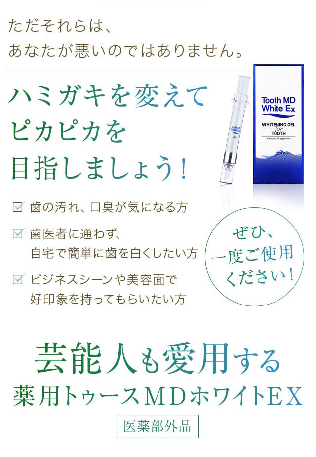 | 研磨剤不使用 で 歯を白くする 歯 の ホワイトニング 歯磨き粉 (歯みがき粉)として 電動歯ブラシでもご使用可能。ヤニ取りクリーナー として 禁煙タバコ 等 禁煙グッズ 愛用者にもおすすめです。 関連ワード【薬用トゥースメディカルホワイトex テゥースmd メディホワ】 |
