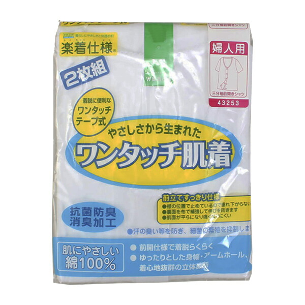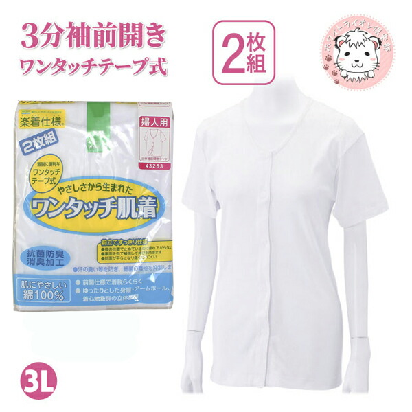 3分袖 前開きシャツ ワンタッチ肌着 ワンタッチテープ式 2枚組 抗菌防臭 消臭 綿100% 大きいサイズ 3L | オールシーズン レディース 綿 介護インナー インナーシャツ 下着