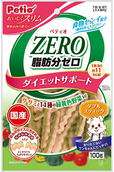 ダイエット中でもおいしいおやつを食べたい!そんなワンちゃんのためのダブルスティック。脂肪分ゼロなのにしっかり美味しい!食物センイ(難消化性デキストリン)配合で満腹感・満足感を保ち、体重管理をサポート!ワンちゃんの健康を考えて、ビタミン・β−カロテン豊富な14種の緑黄色野菜と良質たん白質豊富な鶏ササミをミックスしました。ササミと14種の緑黄色野菜入り。好みのサイズにちぎれるなみなみ形状。食物センイ(難消化性デキストリン)配合。1個当り約10.8kcal。