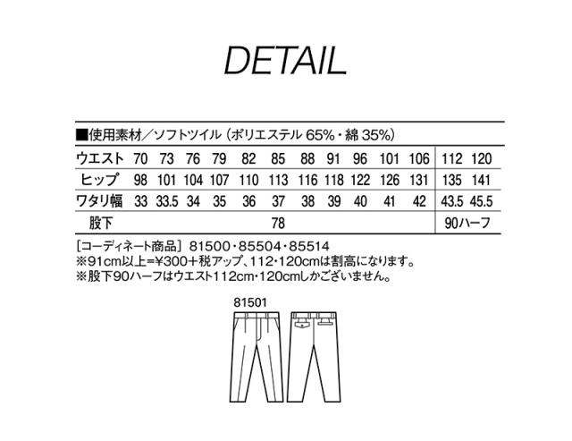 製品制電ワンタックパンツ [年間(定番)] 自重堂 JICHODO 81501 (ポリエステル100%) 91〜106