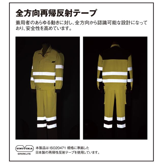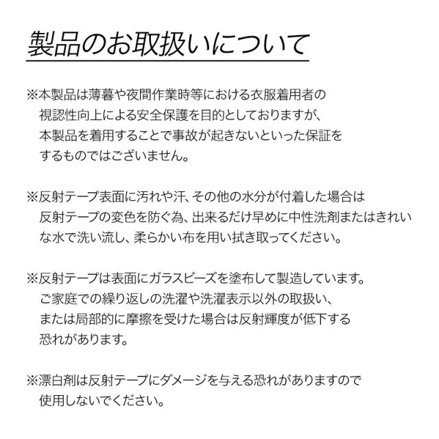 本製品はISO20471 規格 に準拠した日本製の再帰性反射テープを使用しています。着用者のあらゆる動きに対し、全方向から認識可能な設計になっており、安全性を高めています。